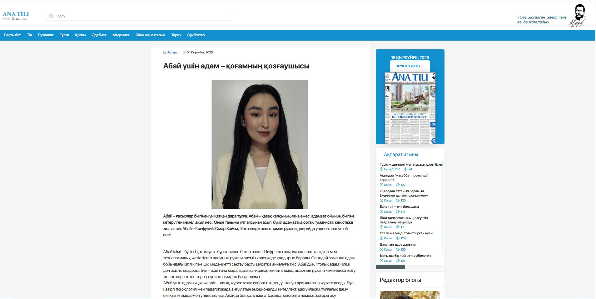 Абай – уникальная личность, звучащая с высоты веков. Абай – совершенный интеллект, вознесшийся на вершины не только казахского народа, но и человеческой мысли. Его знания вышли за рамки нации и открыли путь в общечеловеческое гуманистическое пространство. Абай – мыслитель, способный сопереживать на духовном уровне таким гигантам, как Конфуций, Омар Хайям и Гёте.