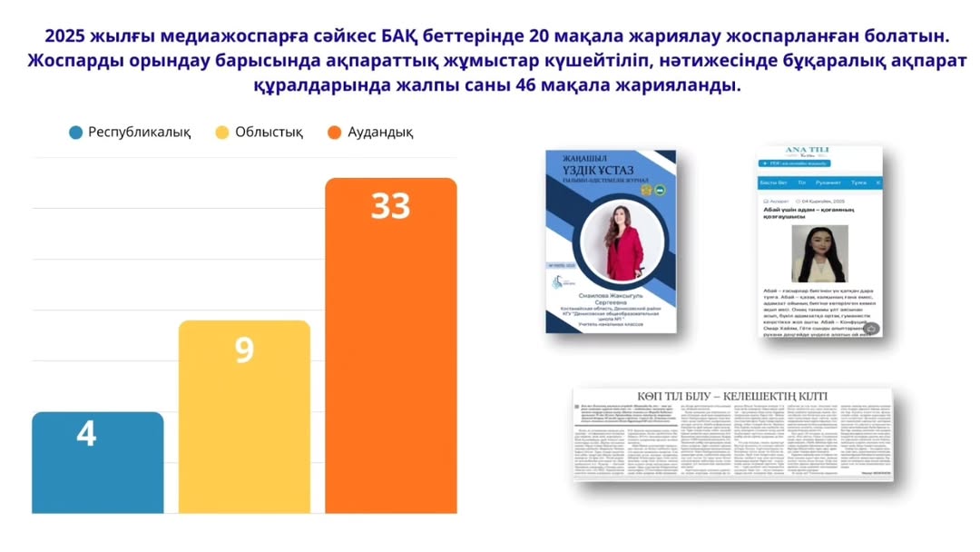 2025 жылғы медиажоспарға сәйкес жоспарланған 20 мақаланың орнына 46 мақала БАҚ беттерінде жарық көрді.