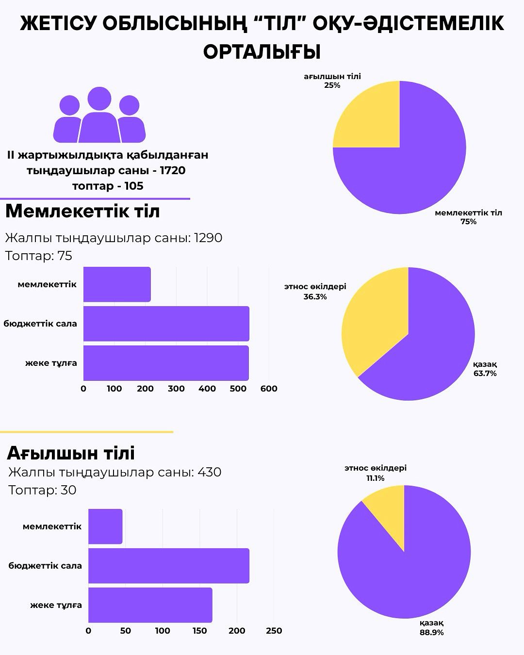 Мемлекеттік тілді оқыту курсына қабылданған тыңдаушылар саны – 1290, топ саны - 75, оның ішінде 218 мемлекеттік, 537 бюджеттік сала қызметкерлері, 535 жеке тұлға. Ұлттық құрамы: 623-і қазақ, 355-і этнос өкілдері.