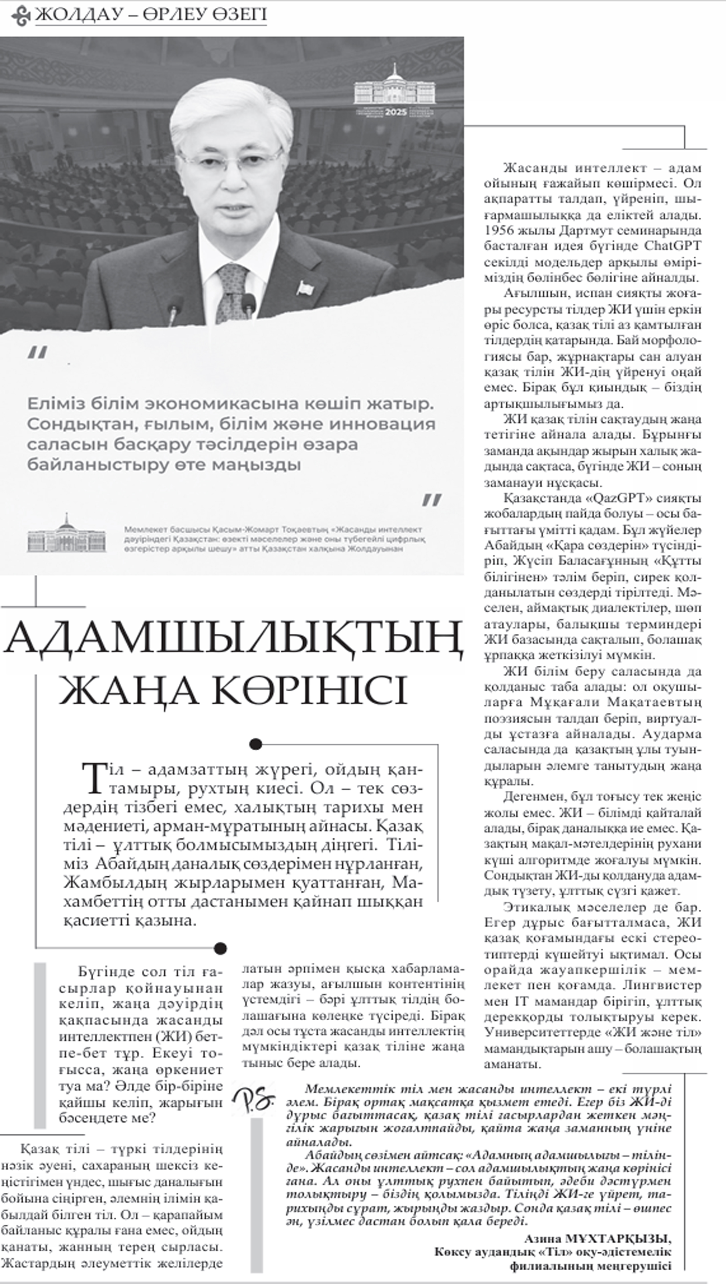 Мемлекеттік тіл мен жасанды интеллект – екі түрлі әлем. Бірақ ортақ мақсатқа қызмет етеді. Егер біз ЖИ-ді дұрыс бағыттасақ, қазақ тілі ғасырлардан жеткен мәң гілік жарығын жоғалтпайды, қайта жаңа заманның үніне айналады. Абайдың сөзімен айтсақ: «Адамның адамшылығы – тілін де». Жасанды интеллект – сол адамшылықтың жаңа көрінісі ғана. Ал оны ұлттық рухпен байытып, әдеби дәстүрмен толықтыру – біздің қолымызда. Тіліңді ЖИ-ге үйрет, та рихыңды сұрат, жырыңды жаздыр. Сонда қазақ тілі – өшпес ән, үзілмес дастан болып қала береді.